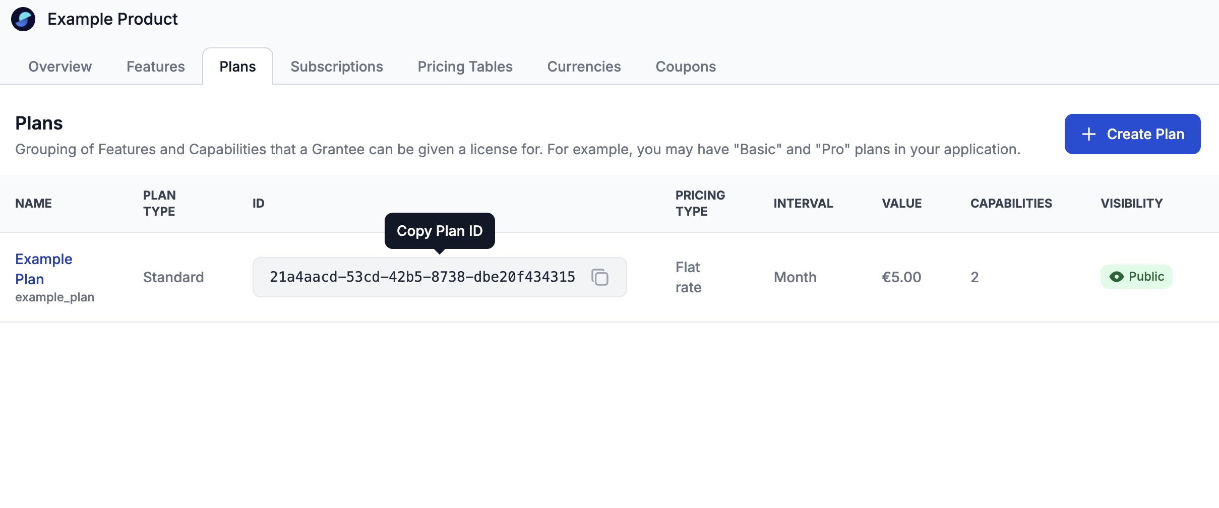 Lastly, go back to the Plans tab and copy the Plan ID, which you'll need for the .env file in the sample app.