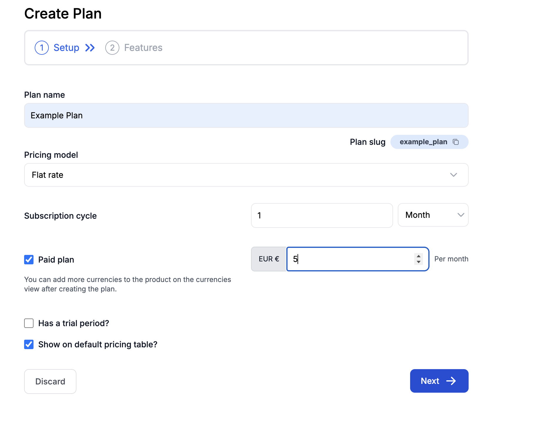 Next, navigate to the Plans tab and create a new plan “Example Plan”. Click on Next.