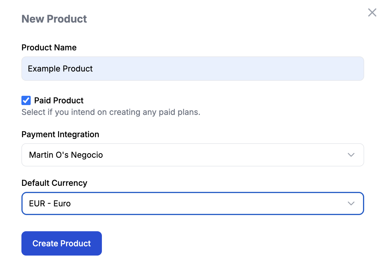 From the Products tab in Salable, create a new product and select Paid Product. Pick the desired Payment Integration and Default Currency.