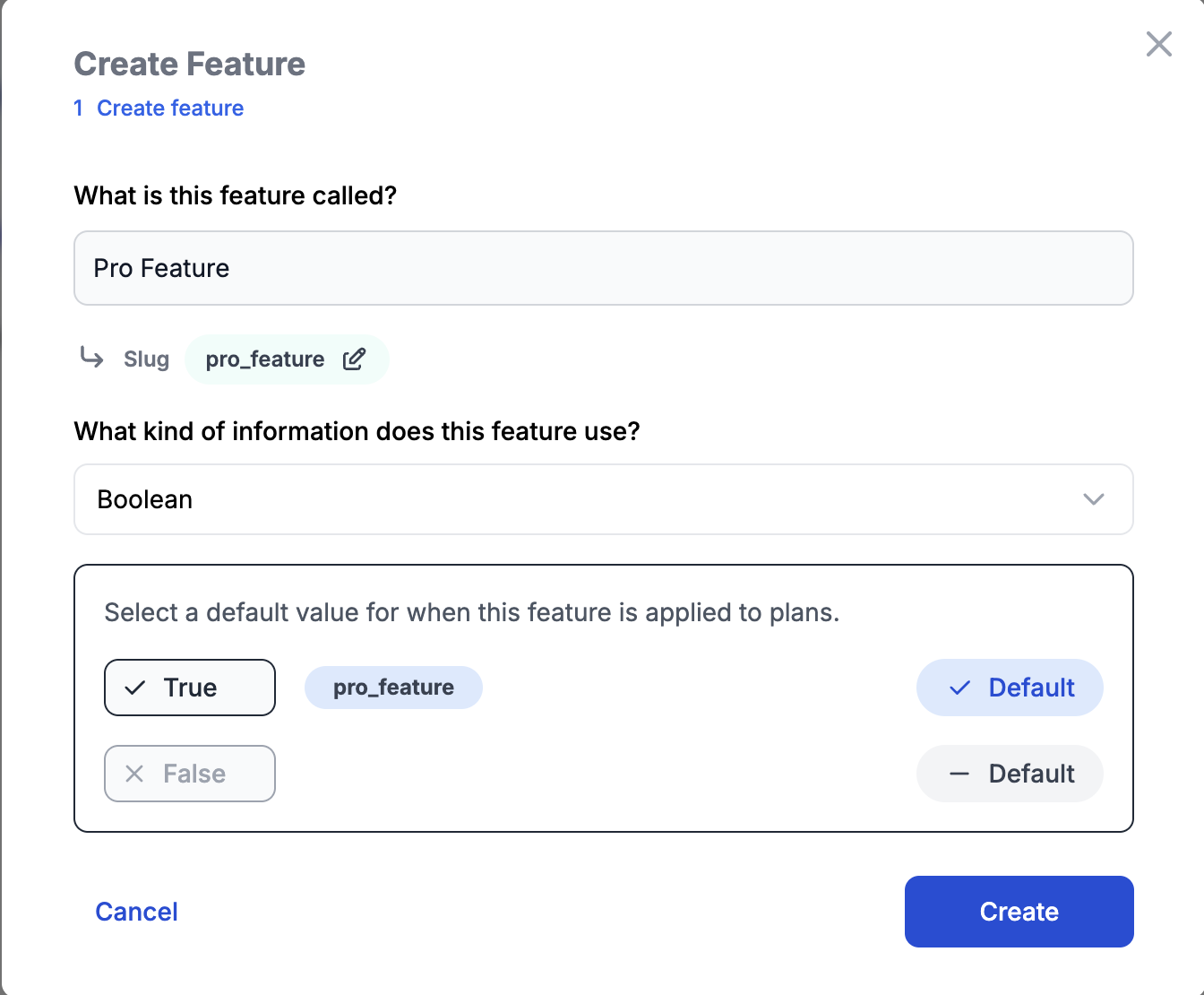 On the next screen, Create Feature and name it "Create". Select Boolean for the Value Type. Click on Create.